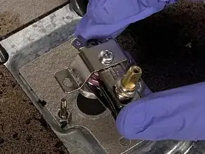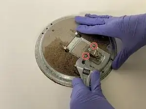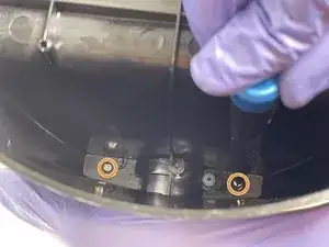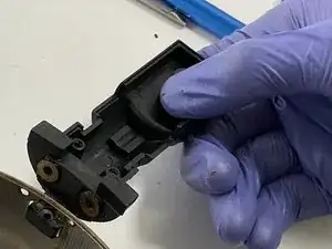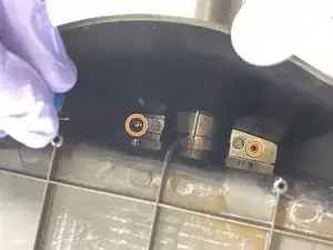 Той же отверткой отвинтите четыре винта 11.5 мм, крепящие кронштейны ручки к пластиковому основанию. (По два с каждой стороны.)