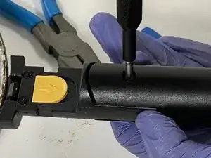 Отверткой Phillips #2 отвинтите один винт 13.7 мм, фиксирующий шарнир, и один винт 19.8 мм, фиксирующий две половины корпуса ручки.