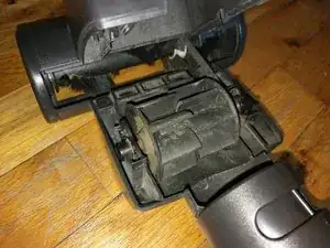 Теперь снимите часть, которая приводит устройство во вращение. Лопасти захватываются разрежением и вращают ремень, который приводит в движение щётку. Чтобы снять узел лопастей, осторожно сожмите маленькие чёрные пластиковые защёлки по обеим сторонам. Это не требует большого усилия — делайте аккуратно: если защёлки сломать, их нельзя будет восстановить.