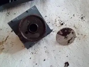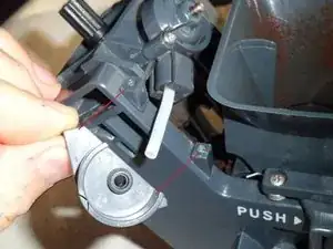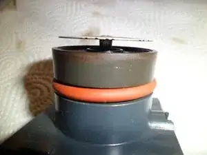 Верхний поршень зафиксирован четырьмя защёлками, по две с каждой стороны. Чтобы снять его, поместите отвёртку вдоль обеих защёлок с одной стороны и, нажимая на них, надавите сверху на поршень. Это ослабит одну сторону, затем повторите то же самое с другой стороны — после этого сборка поршня освободится.