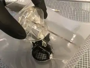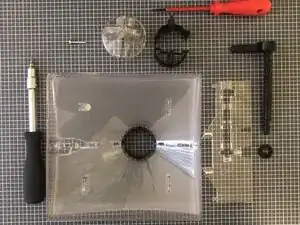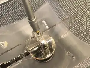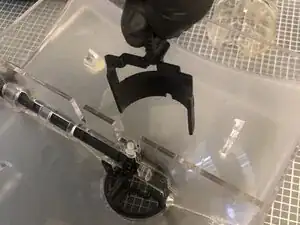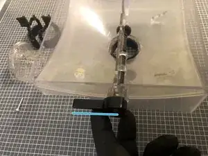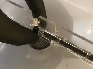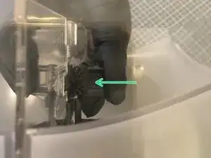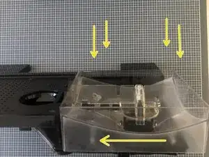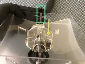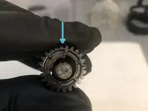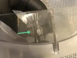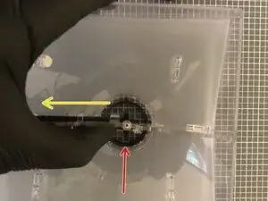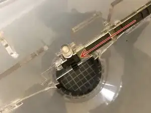 Аккуратно сдвиньте прозрачную перегородку на зубчатом колесе в сторону так, чтобы она слегка выгнулась (на фото это вверх) и одновременно вытащите повернутый рычаг (как описано в предыдущем шаге) наружу (на фото это влево). Это освободит канавку и позволит ей скользнуть над пружиной.