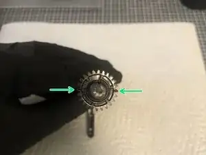 На третьем изображении можно увидеть небольшие зарубки на зубьях в положении 3 и 9 часов на зубчатом колесе в этом положении. Они будут важны позже.