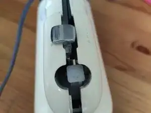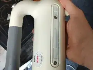 Есть две защелки, которые держат корпус вместе, спереди и снизу, рядом с венчиками. Будьте осторожны, чтобы не сломать их, вы можете попробовать немного потянуть правую сторону миксера вперед, пока отделяете.