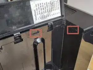 На стороне вокруг бака для воды есть три защёлки. Две из них показаны на первой фотографии. Третья находится слева от двух остальных.