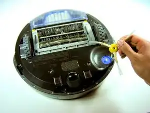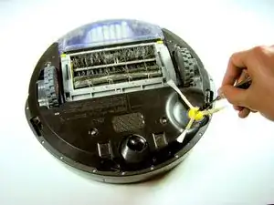Поставьте Roomba вверх тормашками и выключите. Отверткой Phillips 0‑2 снимите один винт 3,5 мм в центре боковой щетки.