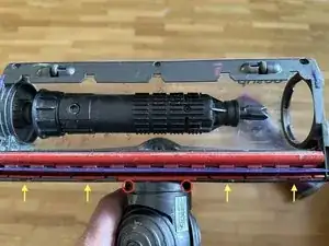Снимите красную крышку, освободив зажимы (жёлтые стрелки) с помощью лопатки, чтобы получить доступ к дополнительным винтам, удерживающим прозрачный кожух.