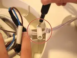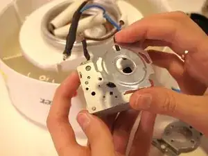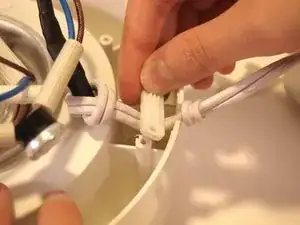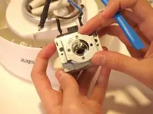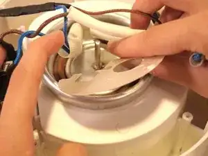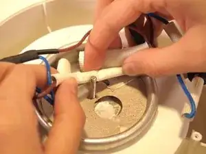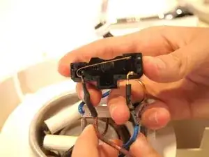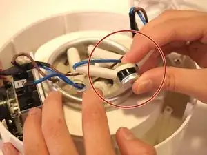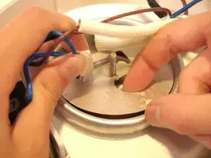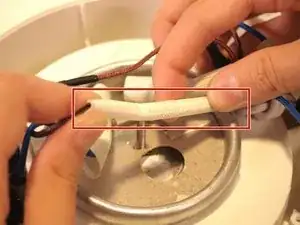 В центре устройства аккуратно возьмитесь за синий провод и извлеките термопредохранитель из его разъёма.
