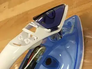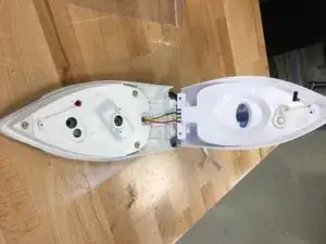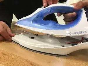 Снимите заднюю пластиковую панель утюга, аккуратно поддев её долотом.