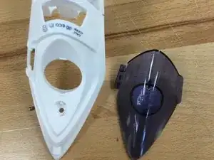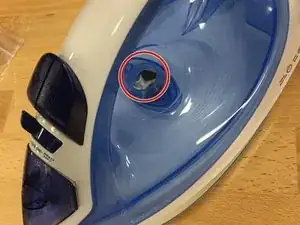 Затем отверткой выкрутите винт под заглушкой. После этого можно снять верхнюю часть корпуса утюга.