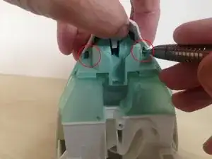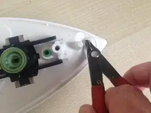 С помощью нейлоновой лопатки или аккуратно маленькой плоской отвертки отожмите заднюю крышку от основного корпуса утюга с обеих сторон, начиная сверху, возле входа кабеля.