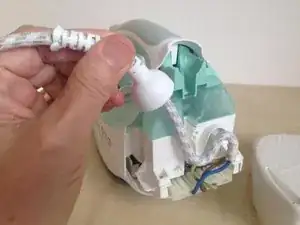 Теперь можно вынуть полусферу ввода сетевого шнура из её гнезда и сам шнур из изгиба растяжителя.