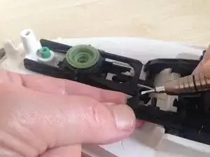 Отсоедините связь между механизмом регулировки температуры и паровым клапаном. Для этого нажмите на одну часть маленькой плоской отверткой, поддерживая другую снизу. Будьте осторожны — эти маленькие пластиковые детали легко сломать.