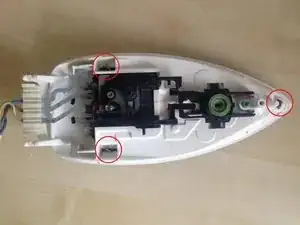 Удалите защитный винт Torx, расположенный ближе к передней части утюга, обнаруженный после снятия верхней крышки.