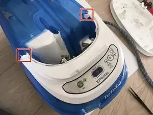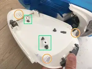 ВНИМАНИЕ! В некоторых случаях могут быть два дополнительных винта, которые фиксируют верхнюю крышку к синему пластиковому основанию. Эти винты находятся под резиновыми бамперами (отмеченными зелеными квадратами на втором фото). Я думаю, что винты были добавлены во время обслуживания в случае, если защелки были сломаны. Это умное решение со стороны Tefal для удобства ремонта.