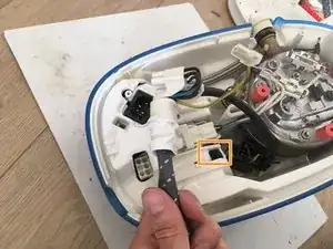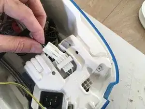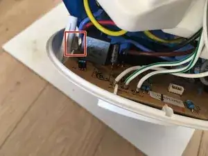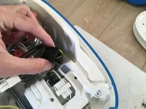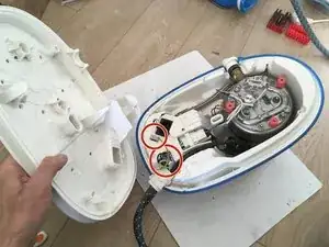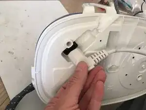 Удалите кабельный разъем, идущий от ручки утюга, потянув его вверх. Также удалите заземляющий кабель, отмеченный на первом фото.
