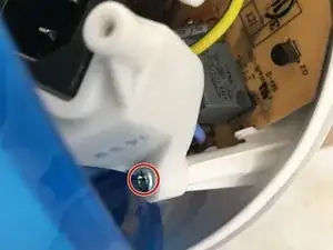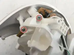 После того как основание снято, мы можем увидеть внутреннюю конструкцию утюга. Блок парогенератора — это большая круглая стальная деталь с блоком нагревателя и датчиками безопасности. Эта большая стальная часть теперь свободна. Если утюг использовался недавно, парогенератор может быть очень горячим, поэтому будьте осторожны.