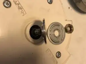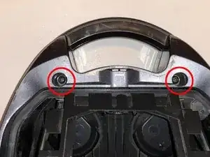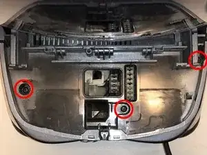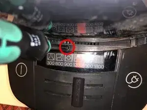 Выверните 1 винт PZ, держущий блок управления на основании. Блок затем можно снять вверх. Лучше захватывать его за панель переключателей питания и смотки шнура. Для отключения плоских разъёмов потребуется небольшое усилие.