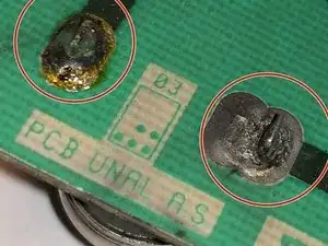 На обратной стороне платы видно неисправное место: припаянное соединение разомкнуто, имитируя сработавший температурный выключатель, отсюда и предупреждение о перегреве.
