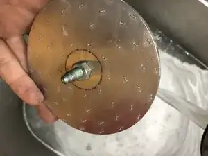 Используйте шпильку и гайку, чтобы закрепить вентилятор на дрели и прокрутить его в воде для тщательной промывки.
