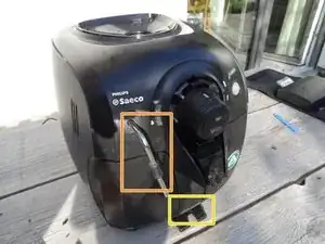 Поставьте машину на бок. На нижней части верхней крышки, слева и справа от носика для кофе, находятся два винта Torx T10. Удалите их.