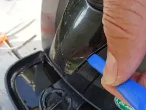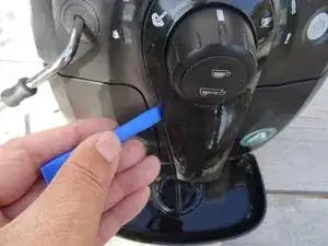 Крышка над носиком для кофе удерживается защелками. Чтобы освободить их, вставьте пластиковый инструмент для открытия. Начните с нижней части, освободите крышку и отложите ее в сторону.