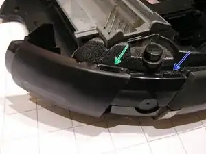 На втором снимке: пластиковую защёлку (зелёная стрелка) боковой панели необходимо аккуратно поддеть над пластиковым выступом (синяя стрелка). После этого боковую часть можно оттянуть назад.