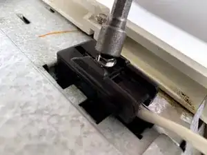 Используя ключ-головку 1/4 дюйма, выверните винт длиной 15,7 мм, крепящий тёмно-коричневую пластиковую крышку проводов.