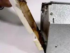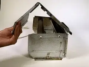 Удерживая нижнюю часть металлической детали, с которой только что сняты винты, поднимите её, пока она полностью не отделится от корпуса тостера.
