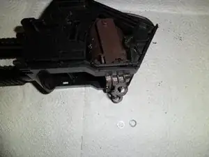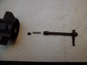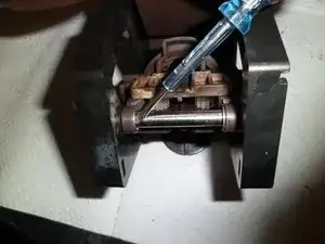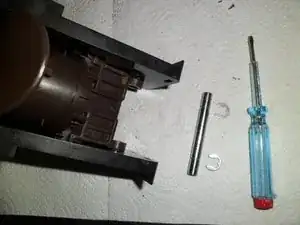 Теперь удалите ось. Внутри находятся два стопорных кольца. Отвертка указывает на одно из них. Используйте отвертку, чтобы освободить эти стопорные кольца.