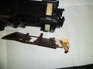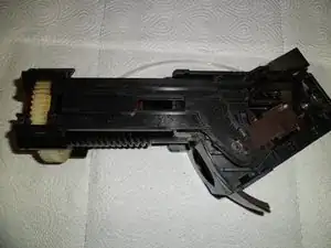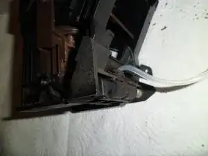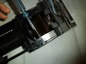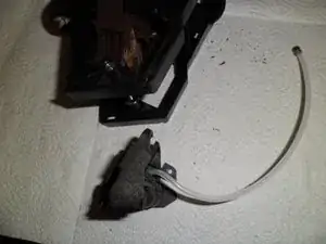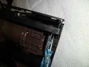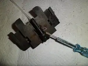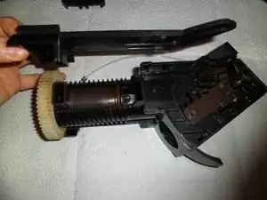 Крышка над белым шестеренчатым колесом имеет 4 зажима, по одному в каждом углу. Используйте маленькую отвертку, чтобы поддеть ее.