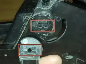 Снимите колесо (рис. 3, оранжевая отметка), оно может сидеть туго. Два белых выключателя (рис. 3, жёлтая отметка) закреплены по два защёлки; освободите их.