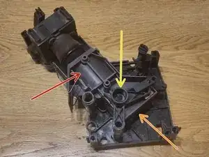 Теперь наденьте стержень (оранжевый круг, рис. 2). Обратите внимание на два маленьких штифта (жёлтые круги, рис. 3). Они должны войти в отверстия в корпусе. Существует только одно правильное положение. Поверните стержень на 180 градусов — вы увидите, что привод один раз находится в корпусе, а в другом положении — нет. Выберите положение, в котором привод находится в корпусе.