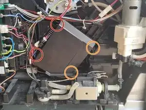 Необходимо снять 6 винтов Torx15, отмеченных красным и оранжевым. Обратите внимание, что винт с оранжевой отметкой скрыт под защёлкивающейся крышкой.