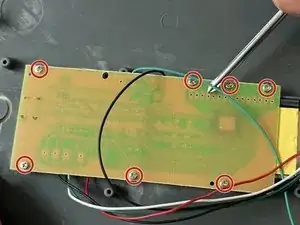Если обнаружено повреждение от жидкости, открутите мини-винты и замените плату.