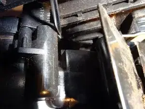 Через отверстие на противоположной стороне от крепёжного винта доступ упрощается. Входной патрубок защёлкнут и удерживается защёлкой, которую нужно отжать в сторону.