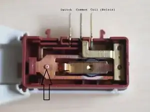 Когда переключатель замыкается, медная пластина со стрелкой на картинке опускается. Снизу заканчивается контакт переключателя снаружи. Его можно снять из пластикового корпуса. Вам следует аккуратно приподнять медную пластину со стрелкой. После снятия можно очистить контактную область нижнего переключателя.