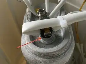 Обратите внимание, что датчик температуры (со стрелкой) был собран неправильно. Он не находится в центре выступа и выступает. Немного ослабьте гайку, чтобы ослабить пружинную штангу, и сдвиньте датчик температуры в центр. Затяните гайку. (Другой конец штанги удерживает термическую предохранитель на месте)