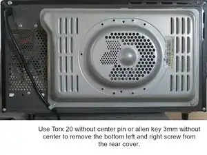 Переверните микроволновую печь, чтобы получить доступ к задней панели. Она закреплена двумя винтами Torx20 без центрального стержня, расположенными в нижнем левом и правом углах. Если у Вас нет подходящей отвёртки, можно аккуратно открутить их шестигранным ключом диаметром 3 мм без центрального стержня. Приподнимите заднюю панель вверх и снимите её, так как сверху она зафиксирована металлическими фиксаторами.