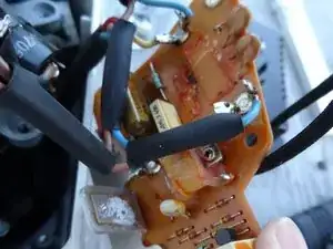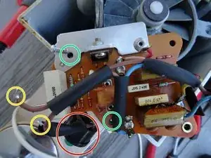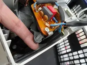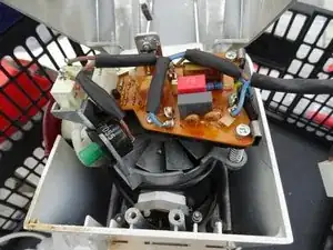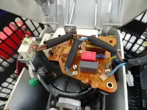 Электроника управления двигателем теперь открыта. Для других моделей плата управления может выглядеть иначе. Но зачастую можно определить дефектные конденсаторы визуально. Замените их и любые дополнительные повреждённые резисторы (если есть). Триак подвергается большим нагрузкам и ломается легко. При необходимости замените его. Перечисленные компоненты очень дешёвые.