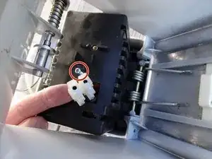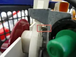 Убедитесь, что штифт на опоре платы входит в направляющую на ручке (отмечено красным прямоугольником на втором фото). При повороте ручки плата должна иметь возможность слегка перемещаться вверх и вниз, иначе машина не будет работать!