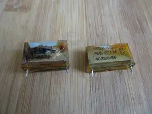 Если у Вас нет всех деталей, обязательно замените два масляных бумажных конденсатора 100 нФ и 150 нФ. Лучше использовать современные MKP-конденсаторы, класс X2, минимум 275 В. Шаг между выводами должен подходить; при необходимости слегка подогните выводы. (например, если шаг 22 мм вместо 20 мм)