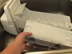 Выньте лоток льдогенератора из отделения для льда и поместите его в раковину, чтобы растопить оставшийся лёд.