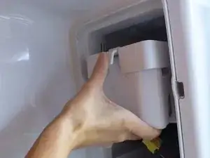 Нажмите рычаг вниз и сдвиньте льдогенератор вперёд, расположенный в самом верху отделения для льда.