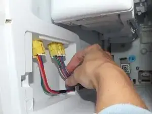 Аккуратно отключите разъём, подключённый к толстой белой трубке, расположенной слева сзади отделения для льда.