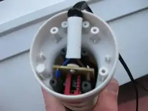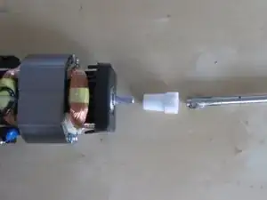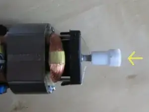 Перевернув, Вы обнаружите проволочный стержень и белый пластиковый элемент, выпавшие внутрь. (Белая пластиковая деталь может также остаться на торце мотора.)