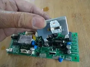 Вот плата питания. Алюминиевый радиатор крепится к задней стороне платы с помощью трёх язычков. Разогните три язычка плоскогубцами и снимите радиатор. Обратите внимание, что он закреплён на симисторе.