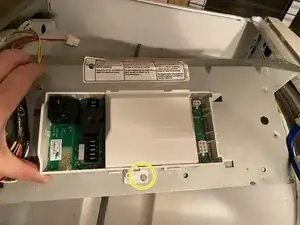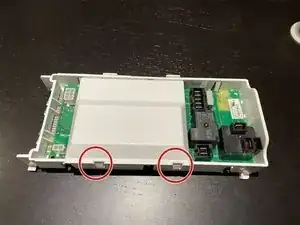 Нажмите на выемку под узлом платы управления, затем сдвиньте узел вперёд, чтобы снять плату.