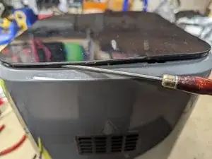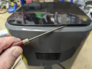 Сзади корпуса найдите узкую щель между панелью управления и корпусом.