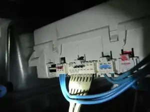 Снимите блок управления, осторожно поддев две внешние защёлки, которые крепят его к поперечине, плоской отвёрткой и одновременно сдвигая блок управления к передней части машины.