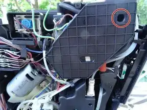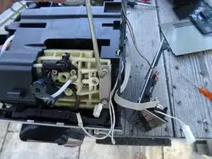 Верхняя опорная пластина поршня теперь свободна. Однако она очень туго сидит, и её трудно извлечь. Действуйте терпеливо и аккуратно. Убедитесь, что лентовый кабель к панели управления не повреждён.